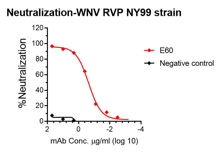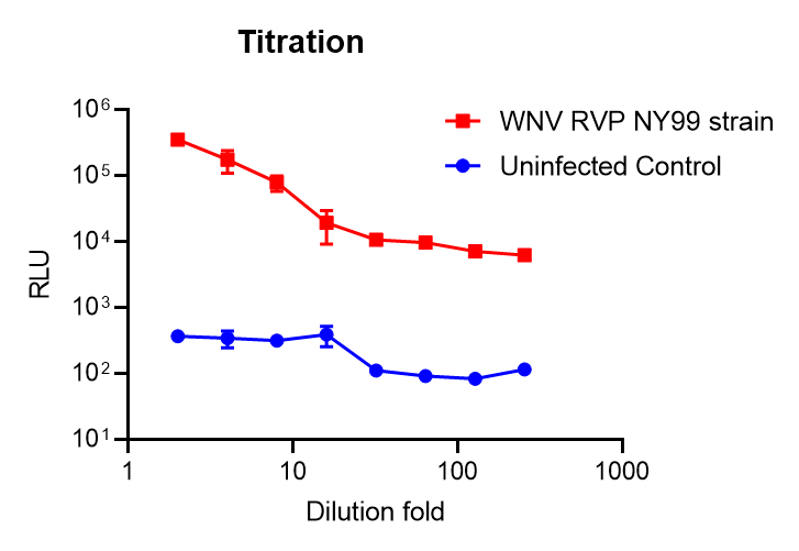 Reporter virus particles (RVPs) package the capsid-preMembrane-envelope (C-prM-E) gene construct of West Nile Virus (WNV) (GenBank: DQ211652.1, NY99 strain) and a Renilla luciferase reporter. As the wild typed WNV is handled under BSL 2 precautions, this WNV RVP can be handled using BSL-2 containment practices. Infection of cells with this RVP carrying Renilla luciferase reporter results in high level Renilla luciferase activity. See our titration result showing that the starting 2-fold diluted RVP-infected target cells (Vero) generates signal ~ 10,000-fold higher than uninfected control (cell alone as background in blue). We also evaluated the neutralizing activity of one known neutralizing monoclonal antibody– E60 that binds to domain DI/DII region of the viral envelope protein. See figure