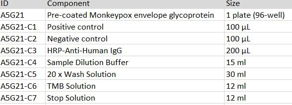 This kit is developed for serologic test for human IgG titer of Anti-Monkeypox envelope GP antibody in serum/plasma or purified human antibody (monoclonal & polyclonal) in vitro. It is for research use only.