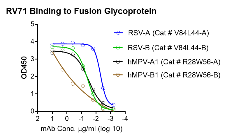 This antibody has been tested to bind to fusion (F) of Respiratory syncytial virus (RSV) subtypes, A and B (Catalog V84L44) as well as human Metapneumovirus (hMPV) subtype A1 and B1 (Catalog R28W56), see figure.