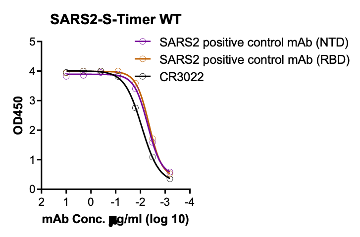 A recombinant trimeric form of the spike glycoprotein (S protein) of SARS-CoV-2 (Wuhan strain, GenBank: MN908947) was produced by human embryonic kidney HEK293 cells, followed by purification. This product contains ectodomain of S protein with S1/S2 cleavage site knocked-down, and also had a pair of mutations (N1067P and L1068P), a HRV3C cleavage site, T4 foldon trimerization domain, C-terminal 8 hexa-histidine tag and twin-strep tag. Twin-strep tag can be used for streptavidin labeling. Amino acid sequence is available upon request. This product has been run on SDS-PAGE with reduced condition and Native blue gels as well as SEC, with results proving trimerization and glycosylation. We also evaluated the binding of two SARS-CoV-2 specific mAbs (RBD-specific clone RV57, Cat.No. F5L83; NTD-specific clone RV94, Cat.No. H28V55) and CR3022 antibody in ELISAs, see results.