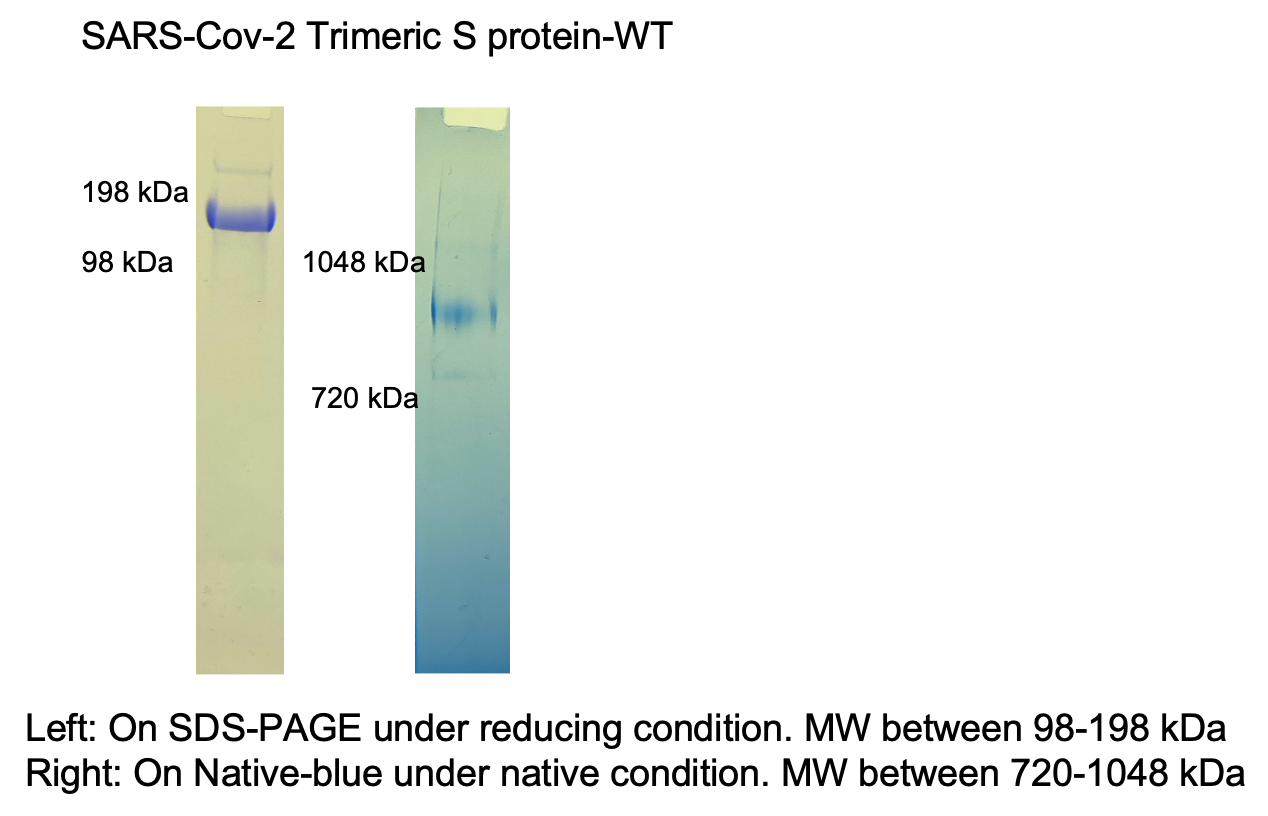 A recombinant trimeric form of the spike glycoprotein (S protein) of SARS-CoV-2 (Wuhan strain, GenBank: MN908947) was produced by human embryonic kidney HEK293 cells, followed by purification.