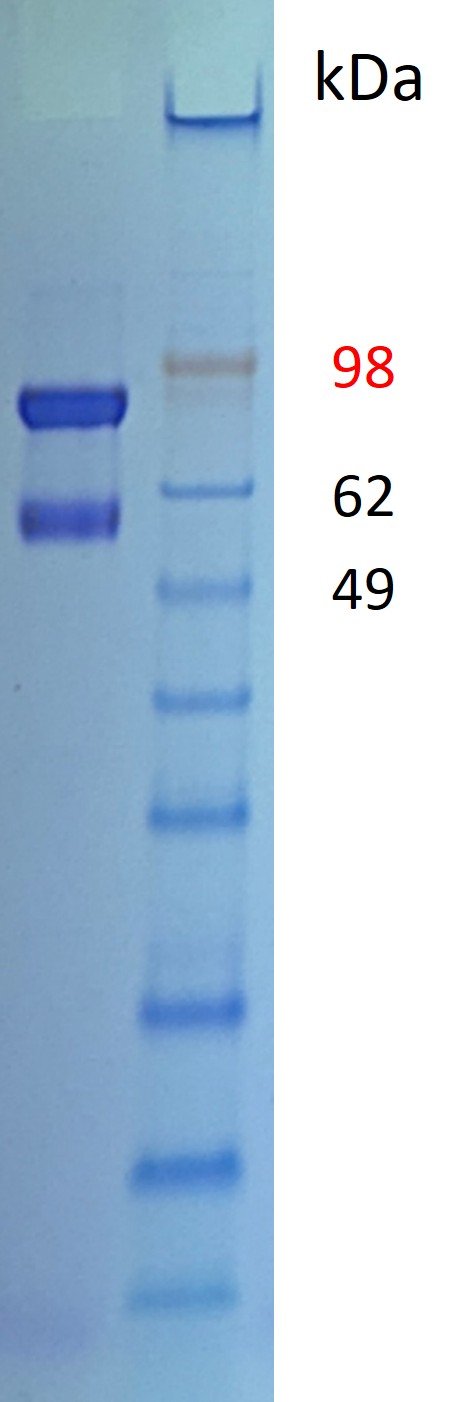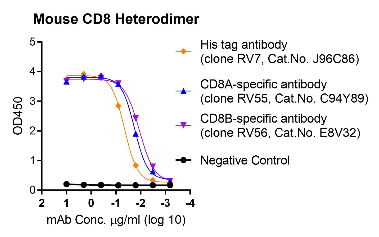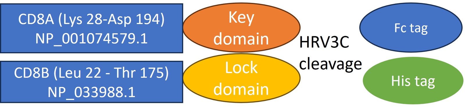 Mouse CD8 alpha&beta (CD8A&CD8B) Heterodimer Protein was produced by human embryonic kidney HEK cells, followed by purification. CD8 alpha (CD8A ectodomain, Lys 28 – Asp 194, Accession: NP_001074579.1) was fused with a domain called “key domain” (proprietary technology), followed with HRV3C cleavage and human Fc tag at the C-terminus. CD8 beta (CD8B ectodomain, Leu 22 – Thr 175, Accession: NP_033988.1) was fused with a domain called “lock domain” (proprietary technology), followed with HRV3C cleavage and 6 hexa-histidine tag at the C-terminus. The binding between key domain and lock domain generates heterodimer of CD8 alpha&beta. The purity has been examined by reducing SDS-PAGE, where protein with the predicted MW of 30 kDa (CD8 beta) and 47 kDa (CD8 alpha) migrates ~ 55 kDa and ~90 kDa. We evaluated its binding to anti-His tag antibody (clone RV7, Cat.No. J96C86), a CD8A-specific antibody (clone RV55, Cat.No. C94Y89), and a CD8B-specific antibody (clone RV56, Cat.No. E8V32) in ELISAs. This protein simultaneously binding to these antibodies validates the heterodimeric conformation. The protein can be cleaved using HRV3C for tag-free.