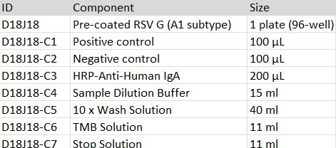 This kit is developed for a standard indirect-ELISA format, providing a rapid detection of anti-RSV glycoprotein (G) human IgA in serum. The kit consists of high-bind detachable 96-well plate pre-coated with G protein, Positive control, Negative Control, an HRP-Anti-Human IgA secondary antibody, TMB and dilution/wash/stop buffer.