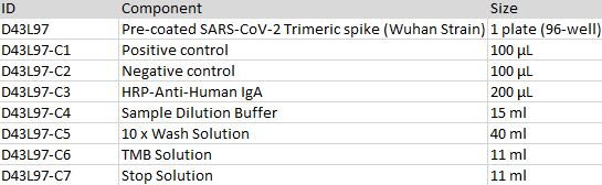 This kit is developed for serologic test for human IgA titer of Anti-SARS-CoV-2 trimeric Spike (Wuhan Strain) antibody from serum/plasma or other tissues (e.g. mucosal samples) in vitro. It is for research use only.