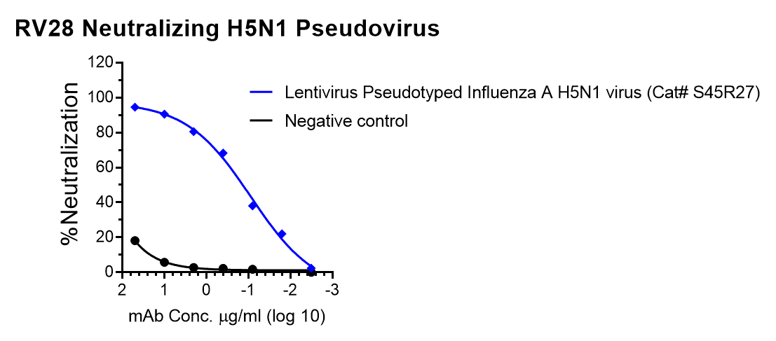 This antibody has been tested to neutralize Lentivirus Pseudotyped Influenza A HPAI H5N1 virus HaNaM with Luciferase Reporter (clade 2.3.4.4b, 2022 strain) (Catalog S45R27). This antibody binds to H5 Hemagglutinin (HA).