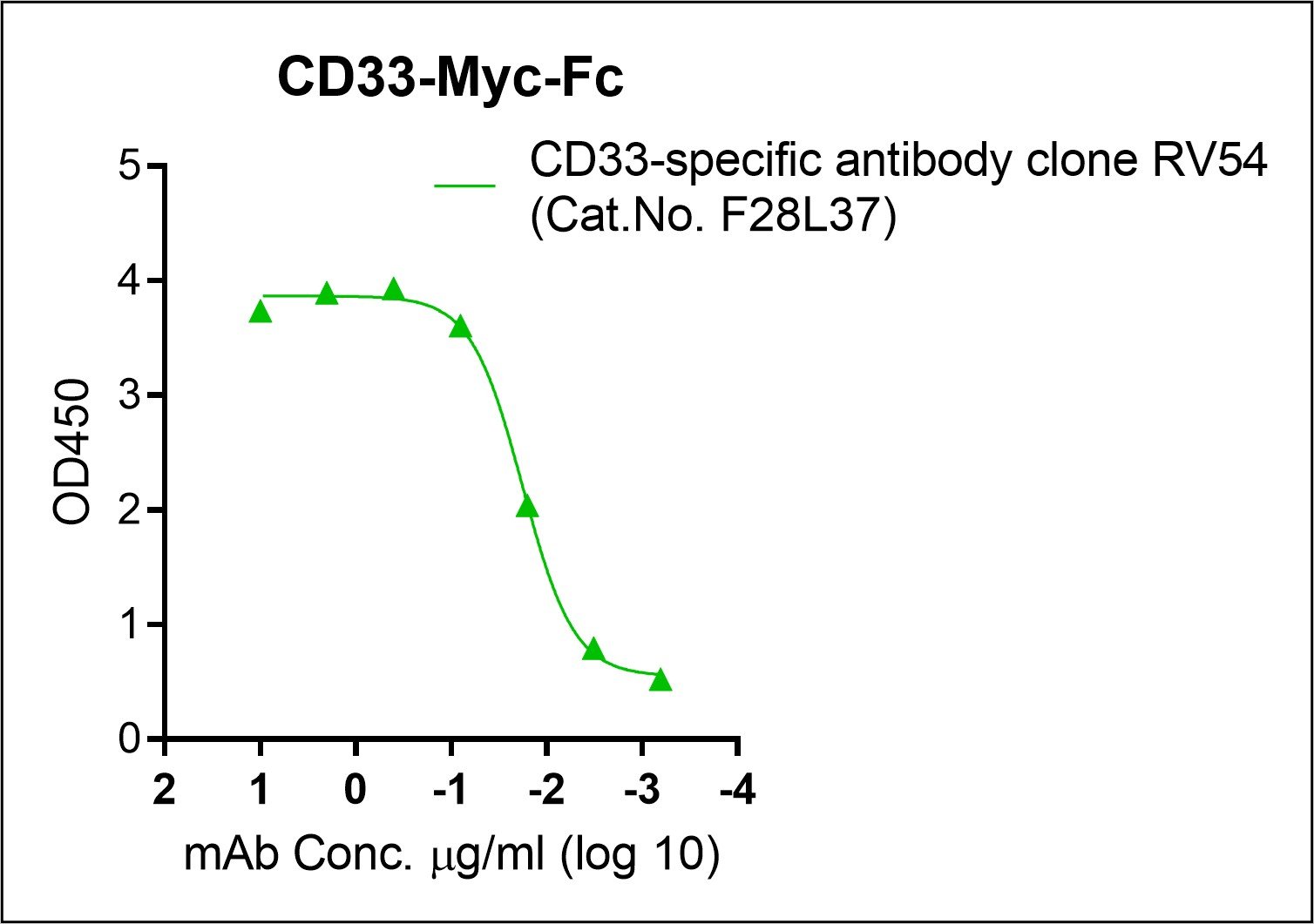 Human CD33/Siglec-3 protein with AA Asp 18 – His 259 (Accession: AAH28152.1) fused with Myc tag and human IgG1 Fc (Fc) tag at the C-terminus was produced by human embryonic kidney HEK cells, followed by purification. Sequence is available upon the request. The purity has been examined >95% as determined by reducing SDS-PAGE, where protein migrates as 62-88 kDa. We evaluated its binding to a CD33-specific antibody clone RV54 (Cat.No. F28L37) in ELISAs, see results.