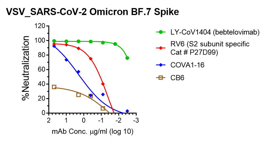 This pseudotyped virus uses recombinant vesicular stomatitis virus (rVSV) to carry spike protein of SARS-CoV-2 (GenBank: MN908947) with multiple mutations initially identified in variant of Omicron BF.7, including: T19I, LPP24-26del, A27S, HV69-70del, G142D, V213G, G339D, R346T, S371F, S373P, S375F, T376A, D405N, R408S, K417N, N440K, L452R, S477N, T478K, E484A, F486V, Q498R, N501Y, Y505H, D614G, H655Y, N679K, P681H, N764K, D796Y, Q954H, N969K. The spike protein has a 18-aa cytoplasmic tail truncation for optimal infection. As pseudovirus infectivity of rVSV without its original G is restricted to a single round of replication, the pseudotypes can be handled using BSL-2 containment practices. Infection of cells with this pseudotyped virus carrying luciferase reporter results in high level luciferase activity. See our titration result showing that the starting 2-fold diluted pseudovirus generates signal ~ 100,000-fold higher than uninfected control (cell alone as background in blue). We also evaluated the neutralizing activity of one own S2-specific antibody RV6, one commercial antibody LY-CoV1404 (bebtelovimab) and two published antibodies: COVA1-16, CB6 by using this pseudotyped virus. The results showed that both COVA1-16 and CB6 antibodies showed reduced or abolished neutralizing activity against this variant, compared with neutralization against WT strain (Cat # P14N41). The neutralization titer for Bebtelovimab is still potent with IC50 < 3.2ng/ml, similar as neutralizing Omicron BA.4/5 (Cat # P63R98). See figure