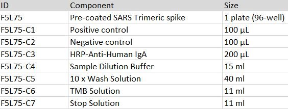 This kit is developed for a standard indirect-ELISA format, providing a rapid detection of anti-SARS Spike human IgA in serum. The kit consists of high-bind detachable 96-well plate pre-coated with trimeric spike protein, Positive control, Negative Control, an HRP-Anti-Human IgA secondary antibody, TMB and dilution/wash/stop buffer.