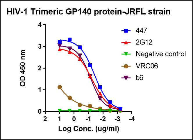A recombinant trimeric form of the HIV-1 glycoprotein (GP protein) from JRFL strain (clade B, GenBank: AAB05604) was produced by human embryonic kidney HEK293 cells, followed by Lectin purification. This product contains ectodomain of GP protein with furin cleavage site knocked-down, T4 foldon trimerization domain, and C-terminal 6 hexa-histidine tag. This product has been evaluated by Native Blue gel and ELISAs, see results.