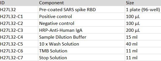 This kit is developed for serologic test for human IgA titer of Anti-SARS Spike RBD antibody from serum/plasma or other tissues (e.g. mucosal samples) in vitro. It is for research use only.