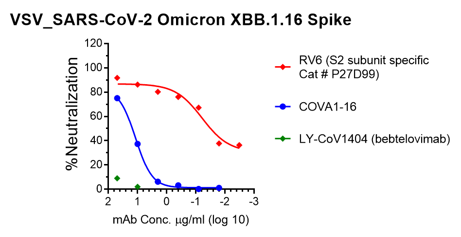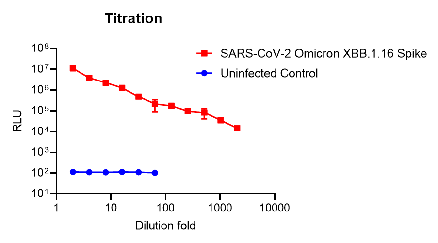 This pseudotyped virus uses recombinant vesicular stomatitis virus (rVSV) to carry spike protein of SARS-CoV-2 (GenBank: MN908947) with multiple mutations initially identified in variant of Omicron XBB.1.16, including: T19I, LPP24-26del, A27S, V83A, G142D, Y144del, H146Q, E180V, Q183E, V213E, G252V, G339H, R346T, L368I, S371F, S373P, S375F, T376A, D405N, R408S, K417N, N440K, V445P, G446S, N460K, S477N, T478R, E484A, F486P, F490S, Q498R, N501Y, Y505H, D614G, H655Y, N679K, P681H, N764K, D796Y, Q954H, N969K. The spike protein has a 18-aa cytoplasmic tail truncation for optimal infection. As pseudovirus infectivity of rVSV without its original G is restricted to a single round of replication, the pseudotypes can be handled using BSL-2 containment practices. Infection of cells with this pseudotyped virus carrying luciferase reporter results in high level luciferase activity. See our titration result showing that the starting 2-fold diluted pseudovirus generates signal ~100,000-fold higher than uninfected control (cell alone as background in blue). We also evaluated the neutralizing activity of one own S2-specific antibody RV6, one commercial antibody LY-CoV1404 (bebtelovimab) and one published antibody COVA1-16 (RBD-specific) by using this pseudotyped virus. The results showed that bebtelovimab showed the abolished neutralizing activity against this variant, and COVA1-16 with significant reduced activity, compared with neutralization against WT strain (Cat # P14N41). The neutralization titer for S2-specific antibody RV6 is 60.8 ng/ml. See figure