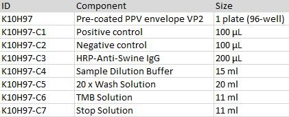 This kit was tested to bind to convalescent swine sera (n = 3) with sensitivity of 80%, specificity of 92% and Cohen’s kappa of 0.85 for PPV VP2 protein.