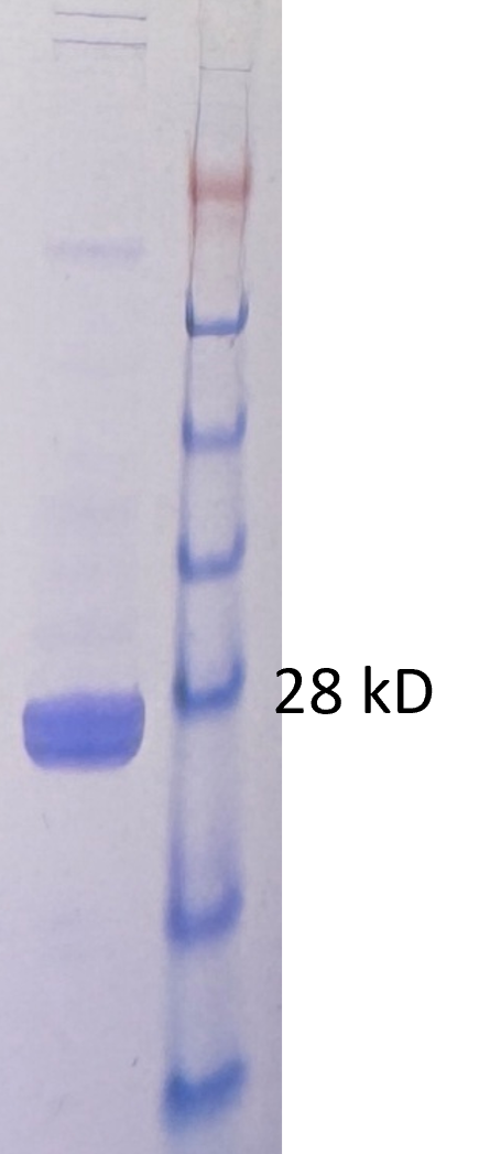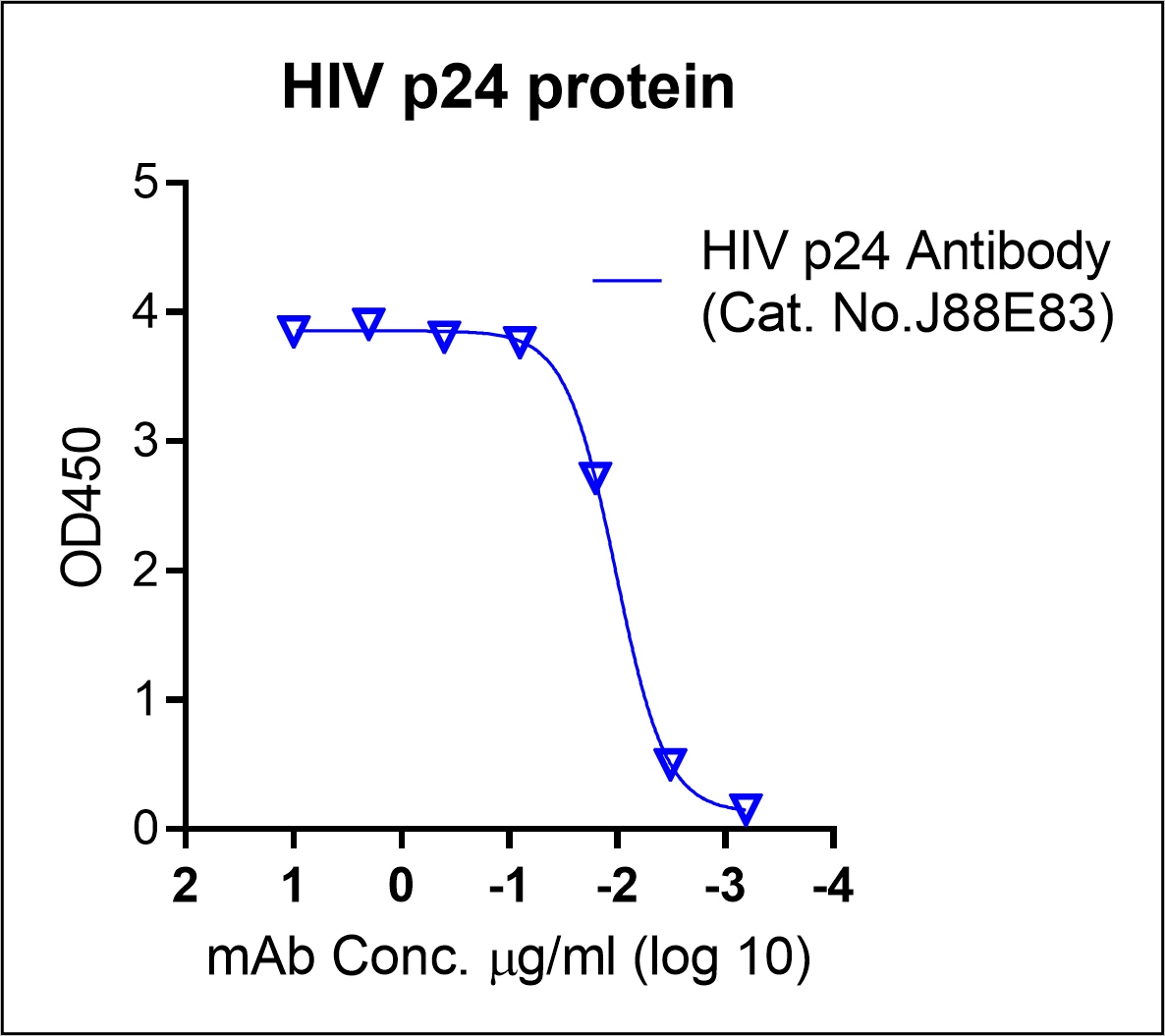 A recombinant form of capsid protein p24 from HIV was produced by insect cells, followed by purification. This product contains C-terminal 6 hexa-histidine tag, followed by an Avi tag. This product has been examined on SDS-PAGE gel with reduced condition (>95% purity) (MW ~28kDa). We evaluated its binding to HIV Gag p24 Monoclonal Antibody Clone RV76 (Cat. No. J88E83) in ELISAs, see results.