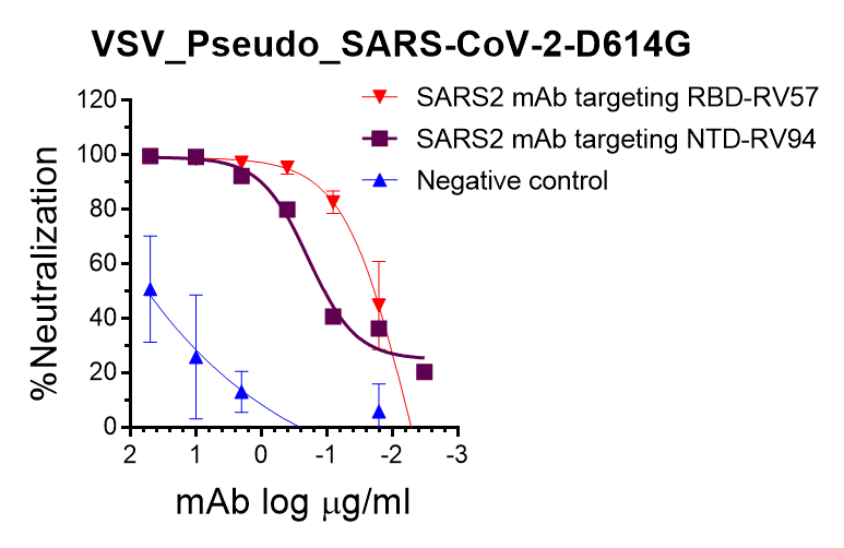 This pseudotyped virus uses recombinant vesicular stomatitis virus (rVSV) to carry a mutated S protein from D (Asp) to G (Gly) at site of 614 of SARS-Cov-2 (GenBank: MN908947), which has a 18-aa cytoplasmic tail truncation for optimal infection. D614G mutant was found to be prevalent from April 2020 and enhances viral transmission (Cell 182, 1-16; 2020). As pseudovirus infectivity of rVSV without its original G is restricted to a single round of replication, the pseudotypes can be handled using BSL-2 containment practices. Infection of cells with this pseudotyped virus carrying luciferase reporter results in high level luciferase activity. See our titration result showing the undiluted pseudovirus (red) generates signal 100,000-fold higher than uninfected control (cell alone as background in blue), and 10-fold higher than WT pseudovirus (green). We also evaluated the neutralizing activity of one SARS2 Positive control mAb by using this pseudotyped virus, see results.