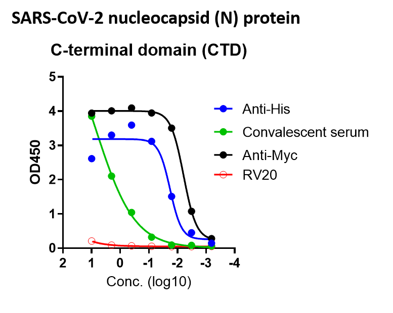 A recombinant form of nucleocapsid (N) protein C-terminal domain (CTD) (AA 255-364) from SARS-CoV-2 virus (Wuhan Strain, GenBank: NC_045512.2) was produced by insect cells, followed by purification. Amino acid sequence is SKKPRQKRTATKAYNVTQAFGRRGPEQTQGNFGDQELIRQGTDYKHWPQIAQFAPSASAFFGMSRIGMEVTPSGTWLTYTGAIKLDDKDPNFKDQVILLNKHIDAYKTFP. This product contains N-terminal Myc tag and C-terminal 6 hexa-histidine tag. This product has been run on SDS-PAGE with reduced condition. We evaluated the binding of this protein to mAb clone RV20 (NTD-specific, Cat# W89S59), two tag-specific antibodies (anti-His or Myc) and one convalescent serum in ELISAs, see results.