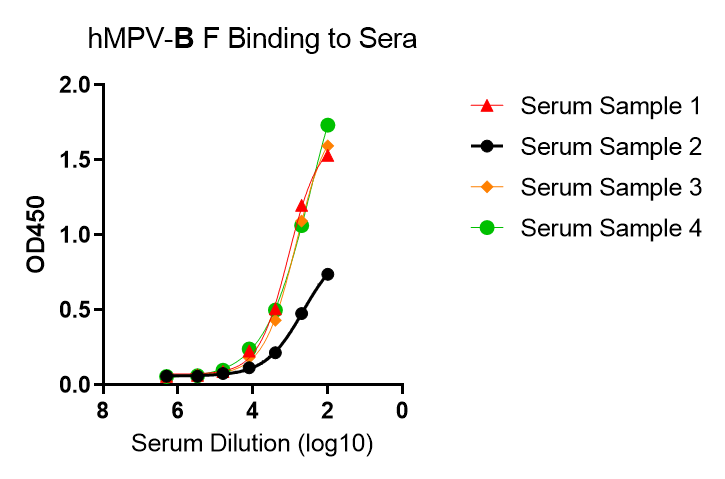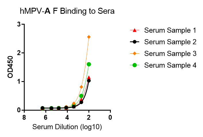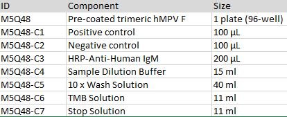 This kit is developed for a standard indirect-ELISA format, providing a rapid detection of anti-hMPV fusion (F) protein human IgM in serum. The kit consists of high-bind detachable 96-well plate pre-coated with trimeric F protein, Positive control, Negative Control, an HRP-Anti-Human IgM secondary antibody, TMB and dilution/wash/stop buffer.