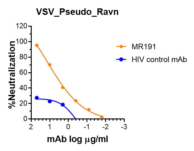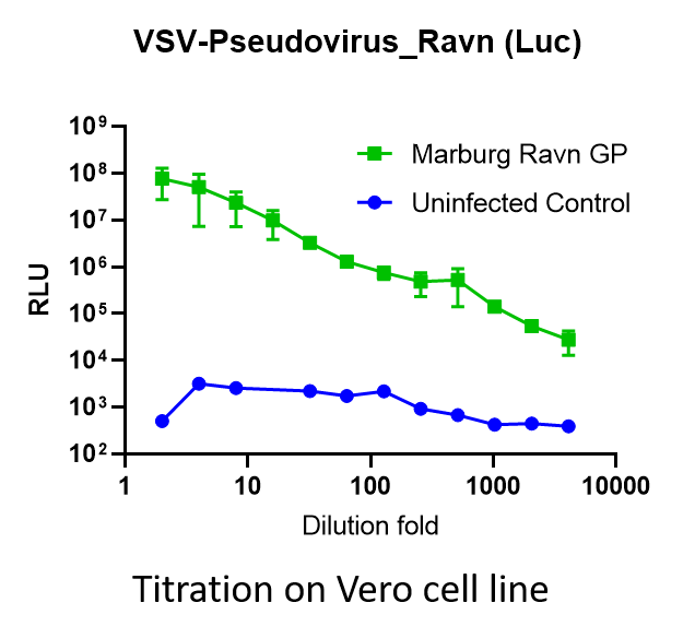 This pseudotyped virus uses recombinant vesicular stomatitis virus (rVSV) to carry GP protein of Marburgvirus – Ravn (GenBank: DQ447649.1). As pseudovirus infectivity of rVSV without its original G is restricted to a single round of replication, the pseudotypes can be handled using BSL-2 containment practices. Infection of cells with this pseudotyped virus carrying luciferase reporter results in high level luciferase activity. See our titration result showing the undiluted pseudovirus (green) generates signal ~100,000-fold higher than uninfected control (cell alone as background in blue). We also evaluated the neutralizing activity of one published mAb called MR191 by using this pseudotyped virus with a HIV control mAb, see results.
