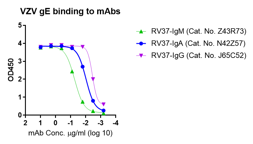 This antibody is bioengineered recombinant purified monoclonal antibody using variable domain sequence of clone RV37-IgG (Cat.No. J65C52) constructed with constant region for IgA format. This antibody has been tested to bind to Varicella-Zoster virus (VZV) gE protein (Cat. No. B93H1). This antibody has been analyzed to compare its IgG (Cat.No. J65C52) format on non-denaturing gel.
