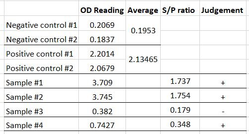 This kit was tested to bind to convalescent sheep sera (n = 4) with sensitivity of 100%, specificity of 75%.