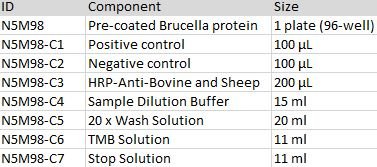 This kit is developed for a standard indirect-ELISA format, providing a rapid detection of anti-Brucella bovine or sheep IgG in serum. The kit consists of high-bind pre-coated, detachable 96-well plate, Positive control, Negative Control, an HRP-Anti-bovine or sheep IgG secondary antibody, TMB and dilution/wash/stop buffer.