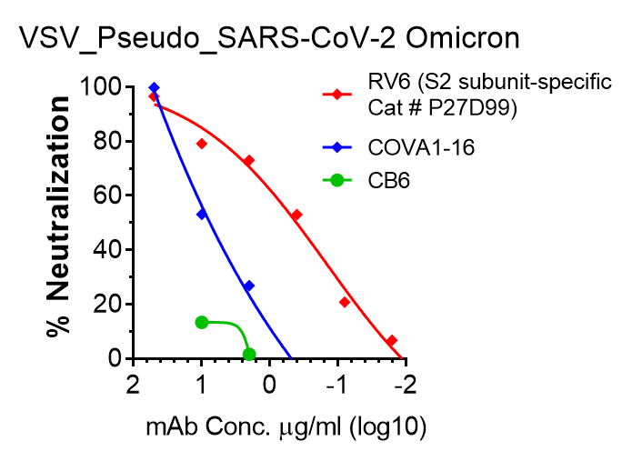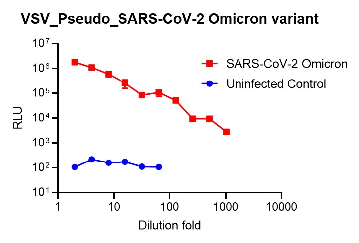 This pseudotyped virus uses recombinant vesicular stomatitis virus (rVSV) to carry spike protein of SARS-CoV-2 (GenBank: MN908947) with multiple mutations initially identified in variant of Omicron (B.1.1.529), including: A67V, Δ69-70, T95I, G142D/Δ143-145, Δ211/L212I, ins214EPE, G339D, S371L, S373P, S375F, K417N, N440K, G446S, S477N, T478K, E484A, Q493R, G496S, Q498R, N501Y, Y505H, T547K, D614G, H655Y, N679K, P681H, N764K, D796Y, N856K, Q954H, N969K, L981F. The spike protein has a 18-aa cytoplasmic tail truncation for optimal infection. As pseudovirus infectivity of rVSV without its original G is restricted to a single round of replication, the pseudotypes can be handled using BSL-2 containment practices. Infection of cells with this pseudotyped virus carrying luciferase reporter results in high level luciferase activity. See our titration result showing that the starting 2-fold diluted pseudovirus generates signal over 10,000-fold higher than uninfected control (cell alone as background in blue). We also evaluated the neutralizing activity of two published control mAbs by using this pseudotyped virus with one losing neutralizing activity against this variant.