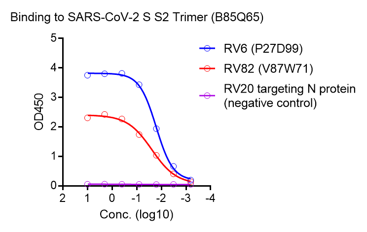 This antibody has been tested to bind to trimeric SARS-CoV-2 Spike S2 subunit protein (Cat.No. B85Q65), and show neutralizing activity against multiple variants, including Wuhan (WT) with D614G mutation (Cat# M32H50), Delta (Cat# D33Z75), Omicron B.1.1.529 (Cat# N64K21), BA.2 (Cat# P40C22), BA.4/5 (Cat# P63R98), BF.7 (Cat# F36Q75), BQ.1.1 (Cat# C50J18), XBB.1.5 (Cat# T35V28), XBB.1.16 (Cat# K10C77) and BA.2.86 (Cat# W19M63).