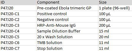 This kit is developed for a standard indirect-ELISA format, providing a rapid detection of anti-Ebola GP mouse IgG in serum. The kit consists of high-bind detachable 96-well plate pre-coated with trimeric GP protein, Positive control, Negative Control, an HRP-Anti-Mouse IgG secondary antibody, TMB and dilution/wash/stop buffer.