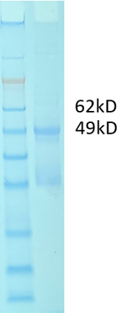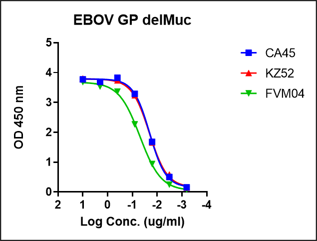 A recombinant Ebola Zaire GPΔmuc protein (derived from strain Makona) consists of resides 32-309 and 461-628 (MLD residues 310-460 and transmembrane domain downstream of residue 628 deleted) and was produced by insect cells, followed by purification. This product contains C-terminal trimerization motif, enterokinase cleavage (DDDDK), a TwinStrep tag and 6 hexa-histidine tag. Amino acid sequence is available upon request. This product has been run on SDS-PAGE with reduced condition. We evaluated the binding of three published antibodies-KZ52, FVM04 and CA45 (Zhao, et al, Cell 2017, 169) in ELISAs, see results.