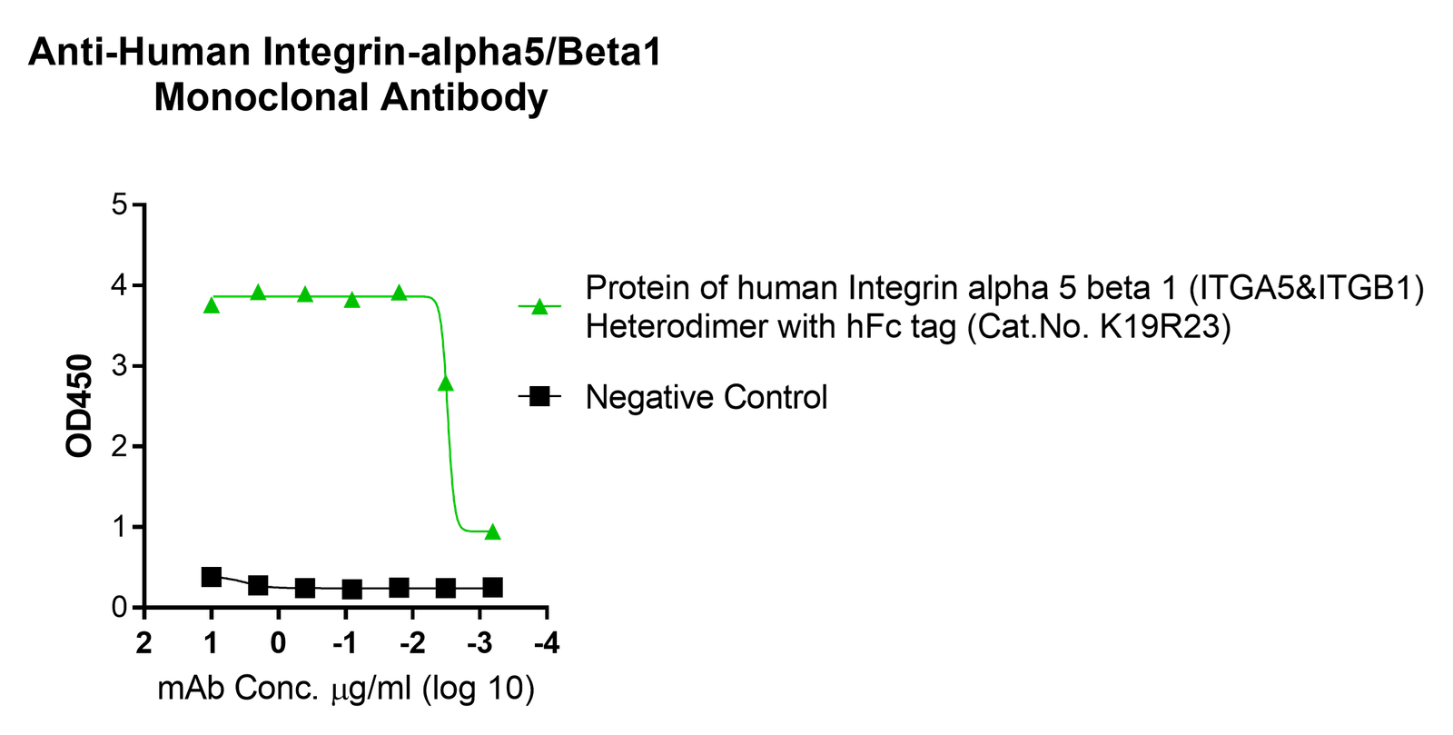 This antibody has been tested to bind to protein of human Integrin alpha 5 beta 1 (ITGA5&ITGB1) Heterodimer with hFc tag (Cat.No. K19R23).