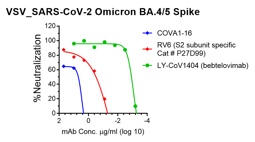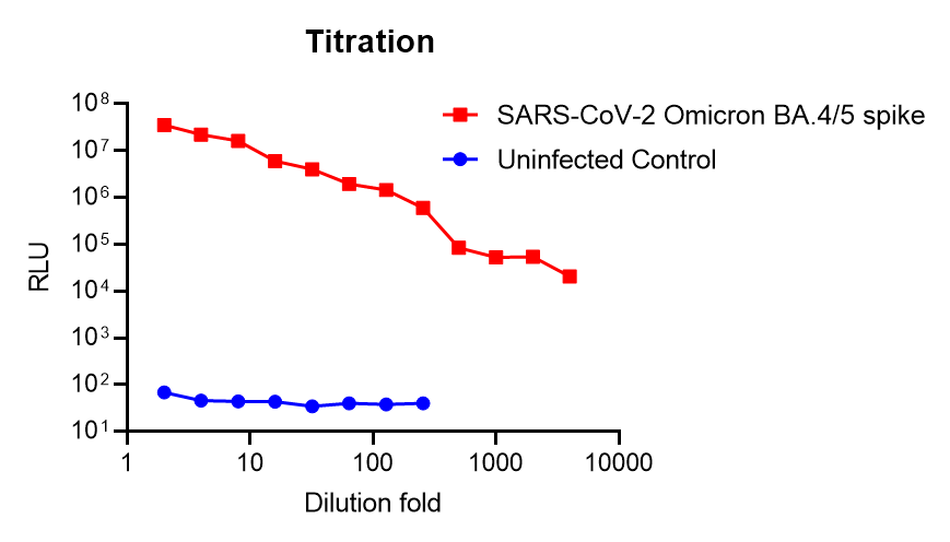 This pseudotyped virus uses recombinant vesicular stomatitis virus (rVSV) to carry spike protein of SARS-CoV-2 (GenBank: MN908947) with multiple mutations initially identified in variant of Omicron BA.4/5 (BA.4 and BA.5 variants share the same Spike mutations), including: T19I, L24S, del25/27, del69/70, G142D, V213G, G339D, S371F, S373P, S375F, T376A, D405N, R408S, K417N, N440K, L452R, S477N, T478K, E484A, F486V, Q498R, N501Y, Y505H, D614G, H655Y, N679K, P681H, N764K, D796Y, Q954H, N969K. The spike protein has a 18-aa cytoplasmic tail truncation for optimal infection. As pseudovirus infectivity of rVSV without its original G is restricted to a single round of replication, the pseudotypes can be handled using BSL-2 containment practices. Infection of cells with this pseudotyped virus carrying luciferase reporter results in high level luciferase activity. See our titration result showing that the starting 2-fold diluted pseudovirus generates signal over 100,000-fold higher than uninfected control (cell alone as background in blue). We also evaluated the neutralizing activity of one own S2-specific antibody RV6, a published antibody COVA1-16 and commercial antibody LY-CoV1404 (bebtelovimab) by using this pseudotyped virus. Both RV6 and COVA1-16 antibodies showed much weaker neutralizing activity against this variant than other variants, and did not reach 100% neutralizing activity at highest concentration. LY-CoV1404 (bebtelovimab) shows potent neutralizing titer (IC50 = 0.87 ng/ml), consistent with a report by others (Cao, Y. et al. Nature 602, 657–663 (2022)). See figure.