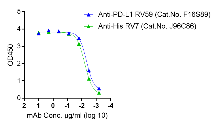Human PD-L1 (programmed death ligand 1) is commonly expressed on dendritic cells and macrophages, and its ectodomain is composed of a membrane distal IgSF V-set and a membrane proximal IgSF C-set domain. PD-L1 is often overexpressed in different tumors, and its interaction with PD-1 on T cells enables cancer cells to evade T-cell-mediated immune responses. A recombinant form (Phe 19 – Arg 238) of PD-L1 protein (Accession: NP_054862.1) with a mutation of Q47E was produced by human embryonic kidney HEK cells, followed by purification. This product contains a 6 hexa-histidine tag at the C-terminus. The purity has been examined >90% as determined by reducing SDS-PAGE, where protein migrates as 30-35 kDa. We evaluated its binding to anti-His tag antibody (clone RV7, Cat.No. J96C86), and a PD-L1-specific antibody (clone RV59, Cat.No. F16S89) in ELISAs, see results.