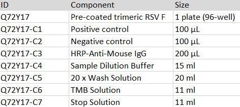 This kit is developed for a standard indirect-ELISA format, providing a rapid detection of anti-RSV fusion (F) protein mouse IgG in serum. The kit consists of high-bind detachable 96-well plate pre-coated with trimeric F protein, Positive control, Negative Control, an HRP-Anti-Mouse IgG secondary antibody, TMB and dilution/wash/stop buffer.