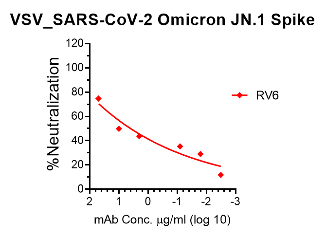 This pseudotyped virus uses recombinant vesicular stomatitis virus (rVSV) to carry spike (S) protein of SARS-CoV-2 (GenBank: MN908947) with multiple mutations initially identified in variant of Omicron JN.1, including: Ins16:MPLF, T19I, R21T, LPP24-26del, A27S, S50L, H69-, V70-, V127F, G142D, Y144-, F157S, R158G, N211-, L212I, V213G, L216F, H245N, A264D, I332V, G339H, K356T, S371F, S373P, S375F, T376A, R403K, D405N, R408S, K417N, N440K, V445H, G446S, N450D, L452W, L455S, N460K S477N, T478K, N481K, V483-, E484K, F486P, Q498R, N501Y, Y505H, E554K, A570V, D614G, P621S, H655Y, I670V, N679K, P681R, N764K, D796Y, S939F, Q954H, N969K, P1143L. The spike protein has a 18-aa cytoplasmic tail truncation for optimal infection. As pseudovirus infectivity of rVSV without its original G is restricted to a single round of replication, the pseudotypes can be handled using BSL-2 containment practices. Infection of cells with this pseudotyped virus carrying luciferase reporter results in high level luciferase activity. See our titration result showing that the starting 2-fold diluted pseudovirus generates signal >50,000-fold higher than uninfected control (cell alone as background in blue). We also evaluated the neutralizing activity of one own S2-specific antibody RV6, with results showing ~75% signal reduction. See figure