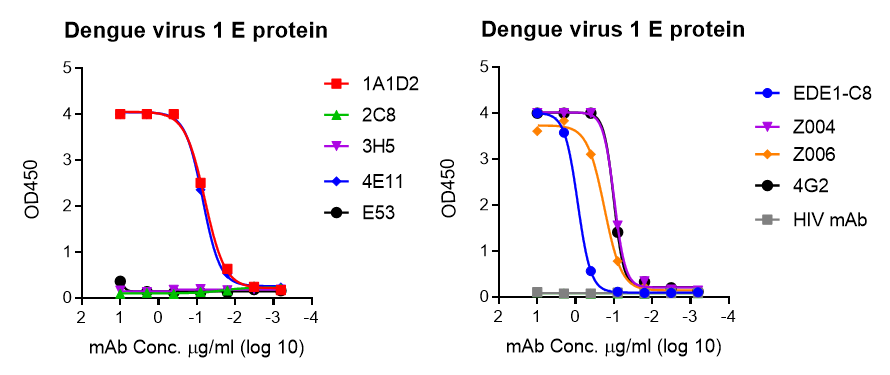 A recombinant form of envelope (E) protein from Dengue virus serotype 1, (GenBank: AAB70694) was produced by insect cells, followed by purification. This product contains N-terminal Myc tag and C-terminal 6 hexa-histidine tag. Amino acid sequence is from 279-678. This product has been run on SEC (superose 6) and SDS-PAGE with reduced condition. The purity is not high. We evaluated the binding of Flavivirus control mAb 4G2 (targets domain II of E protein), and several published Dengue antibodies in ELISAs, see results.