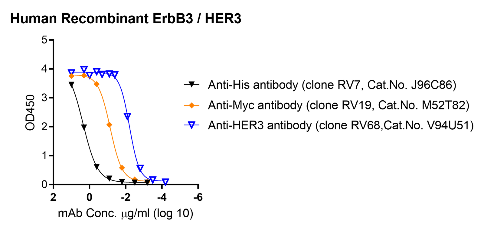 Human ErbB3 / HER3 Protein was produced by human embryonic kidney HEK cells, followed by purification. This recombinant ErbB3 / HER3 (Ser 20 – Thr 643, Accession: P21860-1) was fused with HRV3C cleavage and followed with Myc and 6 hexa-histidine tag at the C-terminus. This design provides an option for the protein to be cleaved using HRV3C for tag-free. The purity has been examined by reducing SDS-PAGE, where protein migrates ~70 kDa. We evaluated its binding to anti-His tag antibody (clone RV7, Cat.No. J96C86), anti-Myc tag antibody (clone RV19, Cat.No. M52T82), and a human HER3-specific antibody (clone RV68, Cat.No. V94U51) in ELISAs, see figure.