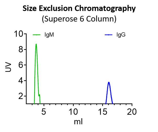 This antibody is bioengineered recombinant purified monoclonal antibody using variable domain sequence of clone RV47-IgG (Cat.No. S99Z30) constructed with constant region for IgM format. This antibody has been tested to bind to fusion (F) glycoprotein of human Metapneumovirus (hMPV) subtype A1 strain (Cat. No. M5Q48-A) or B1 strain (Cat. No. M5Q48-B). An example of comparison of IgM and IgG using size exclusion chromatography (SEC) is shown.
