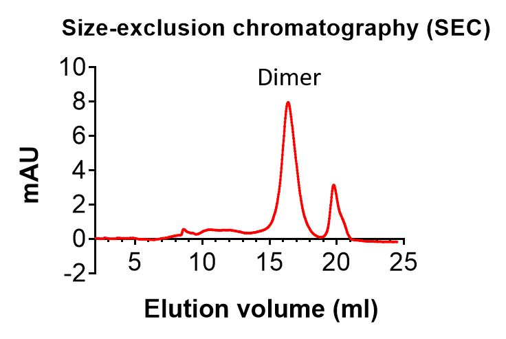 This product has been run on SDS-PAGE with reduced condition. We also evaluated its binding to antibodies of anti-His, anti-Myc or clone RV10. The dimeric conformation was evaluated with SEC (Superose 6 column) with two peaks that we assigned one as a dimer fraction peak. The product is not a SEC fraction.