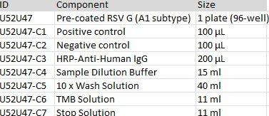 This kit is developed for a standard indirect-ELISA format, providing a rapid detection of anti-RSV glycoprotein (G) human IgG in serum. The kit consists of high-bind detachable 96-well plate pre-coated with G protein, Positive control, Negative Control, an HRP-Anti-Human IgG secondary antibody, TMB and dilution/wash/stop buffer.