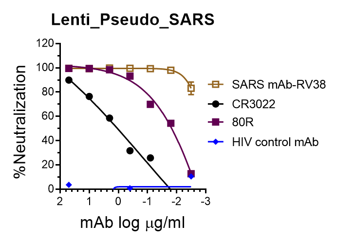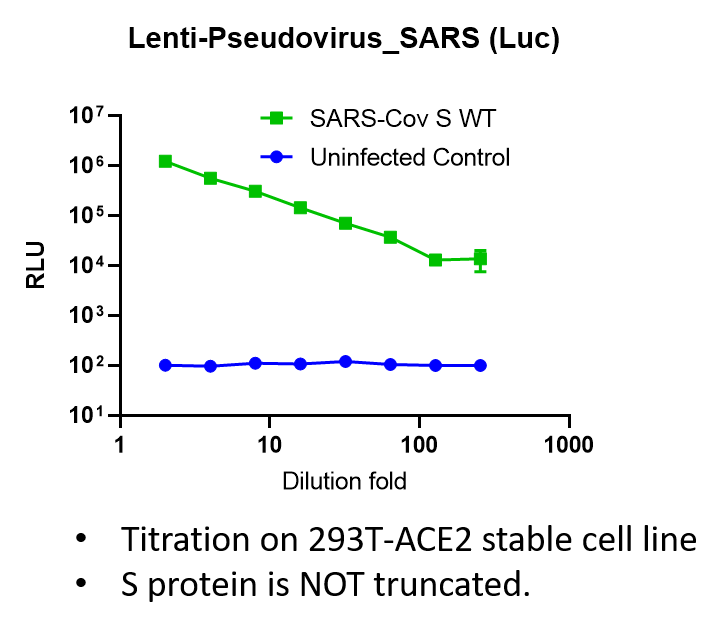 This pseudotyped virus uses lentiviral vectors to package S protein of SARS-Cov (GenBank: DQ412594.1), which was designed by codon optimizing the full-length S sequence for mammalian expression. Infection of cells with this pseudotyped virus carrying luciferase reporter results in detectable luciferase activity. See our titration result showing the undiluted pseudovirus (green) generates signal 10,000-fold higher than uninfected control (cell alone as background in blue). We also evaluated the neutralizing activity of SARS Positive control mAb and 2 published neutralizing mAbs (CR3022 and 80R) by using this pseudotyped virus, see results.