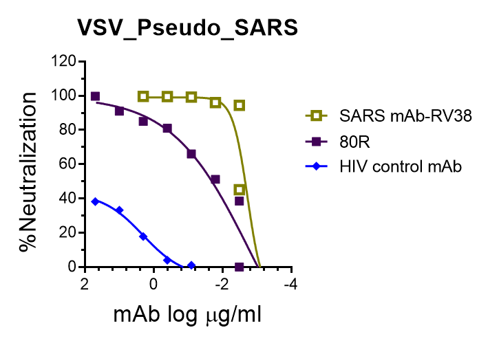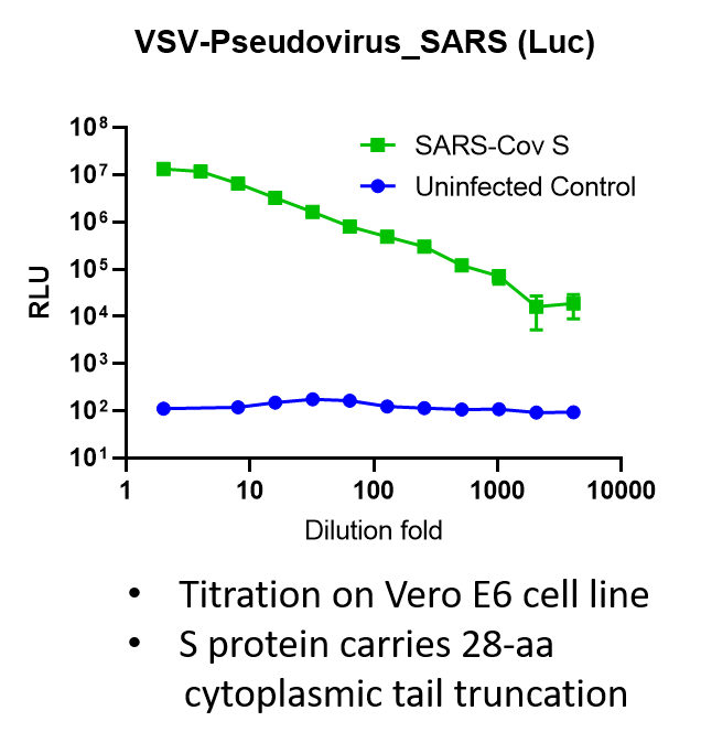 This pseudotyped virus uses recombinant vesicular stomatitis virus (rVSV) to carry S protein of SARS-Cov (GenBank: AY278554.2), which has a 28-aa cytoplasmic tail truncation for optimal infection. As pseudovirus infectivity of rVSV without its original G is restricted to a single round of replication, the pseudotypes can be handled using BSL-2 containment practices. Infection of cells with this pseudotyped virus carrying luciferase reporter results in high level luciferase activity. See our titration result showing the undiluted pseudovirus (green) generates signal 100,000-fold higher than uninfected control (cell alone as background in blue). We also evaluated the neutralizing activity of our SARS Positive control mAb and one published mAb called 80R by using this pseudotyped virus, see results.