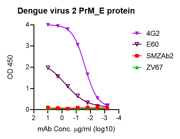 A recombinant form of polyprotein propeptide (Pr), matrix (M), envelope (E) protein from Dengue virus serotype 2, (strain 16681, GenBank: AAA73185) was produced by insect cells, followed by purification. A TEV linker was used to replace transmembrane domain (TM) and the cleavage site was knocked down. This product contains C-terminal Myc and 6 hexa-histidine tags. Amino acid sequence is available upon request. This product has been run on SEC (superose 6) and SDS-PAGE under reduced condition with >90% purity (estimated MW 61 kD). We evaluated the binding of Flavivirus control mAb 4G2, E60 and two published antibodies (Zika ones as negative controls) in ELISAs, see results.