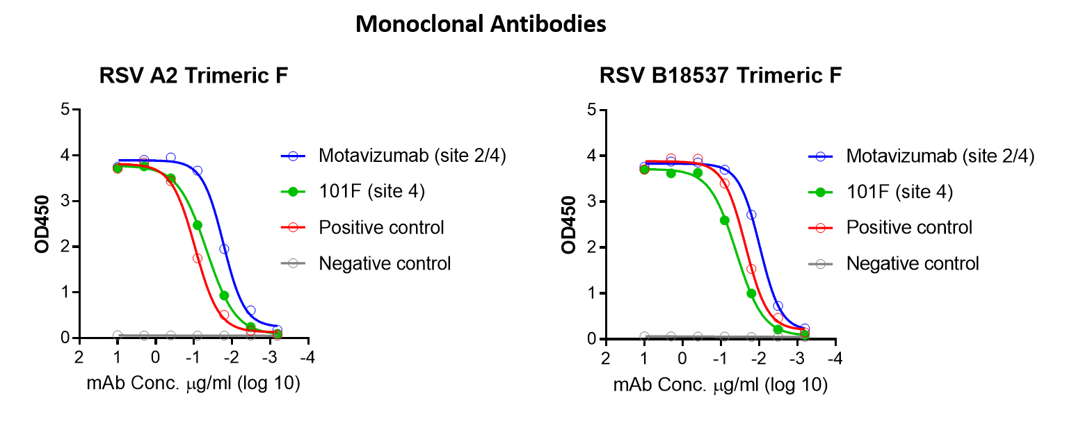 These kits were tested to bind to published monoclonal antibodies (site 2/4-specific motavizumab or site 4-specific 101F) or human sera, see figures.