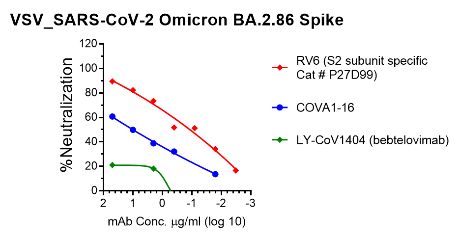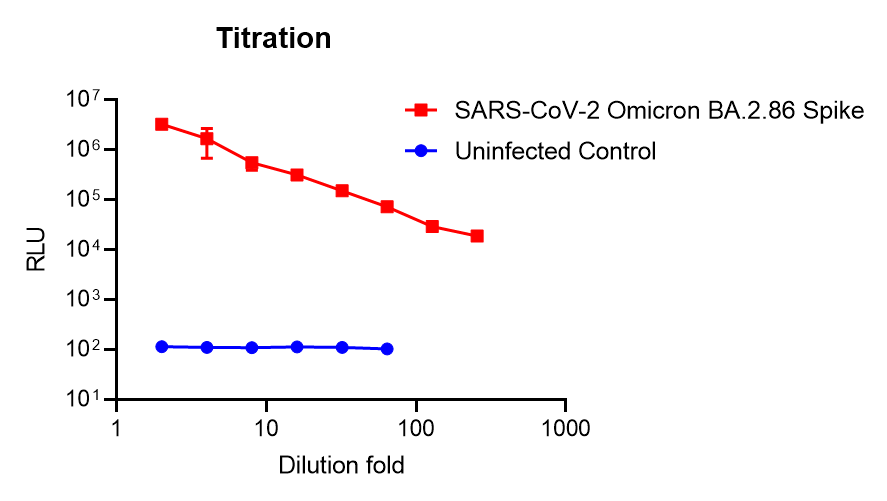This pseudotyped virus uses recombinant vesicular stomatitis virus (rVSV) to carry spike (S) protein of SARS-CoV-2 (GenBank: MN908947) with multiple mutations initially identified in variant of Omicron BA.2.86, including: Ins16:MPLF, T19I, R21T, LPP24-26del, A27S, S50L, H69-, V70-, V127F, G142D, Y144-, F157S, R158G, N211-, L212I, V213G, L216F, H245N, A264D, I332V, G339H, K356T, S371F, S373P, S375F, T376A, R403K, D405N, R408S, K417N, N440K, V445H, G446S, N450D, L452W, N460K S477N, T478K, N481K, V483-, E484K, F486P, Q498R, N501Y, Y505H, E554K, A570V, D614G, P621S, H655Y, I670V, N679K, P681R, N764K, D796Y, S939F, Q954H, N969K, P1143L. The spike protein has a 18-aa cytoplasmic tail truncation for optimal infection. As pseudovirus infectivity of rVSV without its original G is restricted to a single round of replication, the pseudotypes can be handled using BSL-2 containment practices. Infection of cells with this pseudotyped virus carrying luciferase reporter results in high level luciferase activity. See our titration result showing that the starting 2-fold diluted pseudovirus generates signal ~50,000-fold higher than uninfected control (cell alone as background in blue). We also evaluated the neutralizing activity of one own S2-specific antibody RV6, one commercial antibody LY-CoV1404 (bebtelovimab) and one published antibody COVA1-16 (RBD-specific) by using this pseudotyped virus. The results showed that bebtelovimab showed the abolished neutralizing activity against this variant, and COVA1-16 with significant reduced activity, compared with neutralization against WT strain (Cat # P14N41). The neutralization titer for S2-specific antibody RV6 is 80 ng/ml. See figure