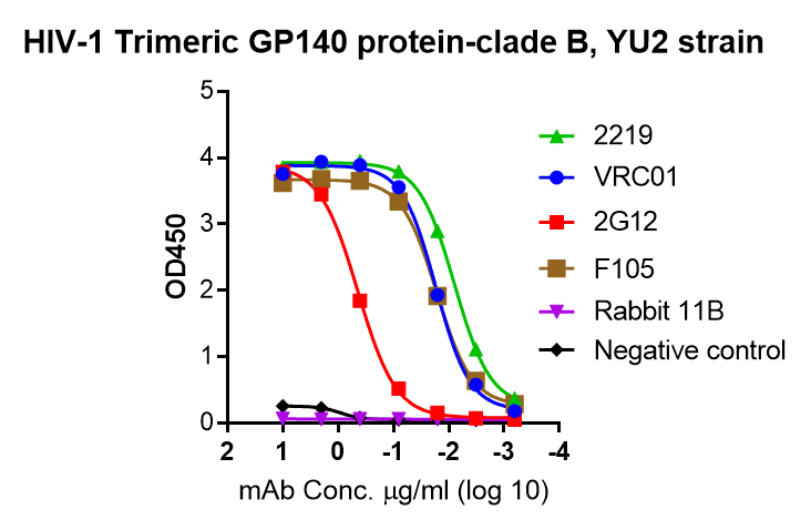 A recombinant trimeric form of the HIV-1 glycoprotein (GP protein) from YU2 strain (clade B, GenBank: QHJ92204) was produced by human embryonic kidney HEK293 cells, followed by Lectin purification. This product contains ectodomain of GP protein with furin cleavage site knocked-down, T4 foldon trimerization domain, and C-terminal 6 hexa-histidine tag. Amino acid sequence is available upon request. This product has been evaluated by Native Blue gel and Size Exclusion Chromatography (SEC) to confirm the trimer formation, SDS-PAGE for purity as well as ELISAs for binding, see results. A rabbit antibody 11B that targets 241 glycan hole (BG505 specific, catalog U90R79) does not to bind to this protein (ref: Cell Rep. 2016;16(9):2327-38.).