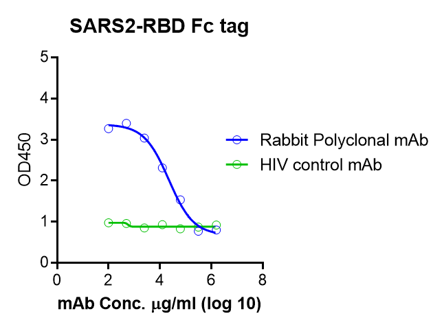 A recombinant form of the receptor binding domain (RBD with amino acids 333 to 529) of the spike (S) glycoprotein gene from severe acute respiratory syndrome-related coronavirus 2 (SARS-CoV-2), Wuhan-Hu-1 (GenBank: MN908947) was produced by human embryonic kidney HEK293 cells, followed by purification. This product contains C-terminal human IgG Fc tag. Amino acid sequence is available upon request. This product has been run on SDS-PAGE with reduced condition. We also evaluated the binding to Rabbit polyclonal mAb in ELISAs, see results.