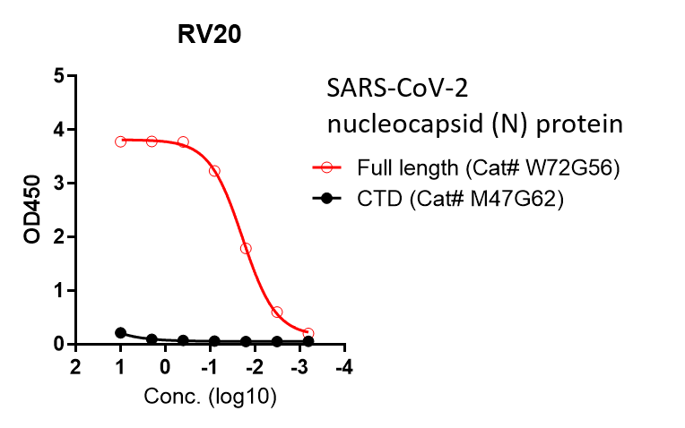 This antibody binds to SARS-CoV-2 nucleocapsid (N) protein full length (Cat# W72G56) but not C-terminal domain (CTD) (Cat# M47G62).