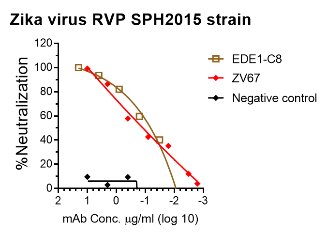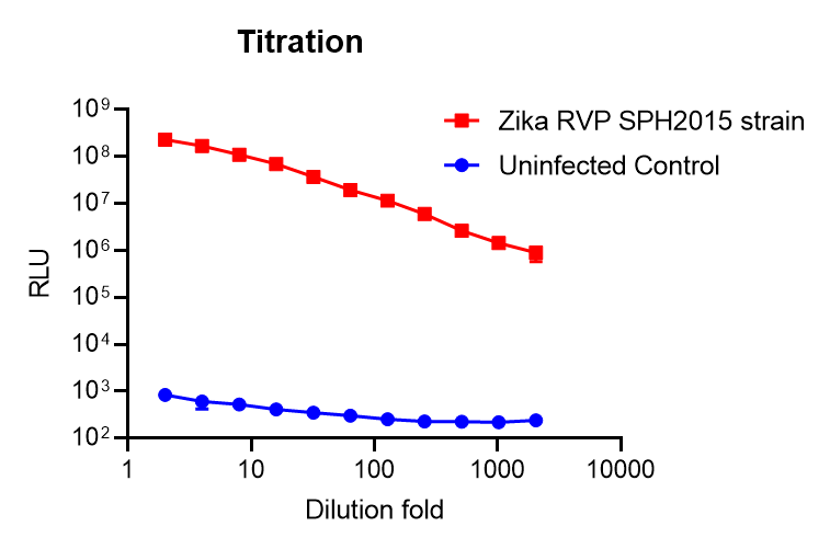 Reporter virus particles (RVPs) package the capsid-preMembrane-envelope (C-prM-E) gene construct of ZIKV (GenBank: KU321639.1, SPH2015 strain) and a Renilla luciferase reporter. As the wild typed Zika virus is handled under BSL 2 precautions, this Zika virus RVP can be handled using BSL-2 containment practices. Infection of cells with this RVP carrying Renilla luciferase reporter results in high level Renilla luciferase activity. See our titration result showing that the starting 2-fold diluted RVP-infected target cells (Vero) generates signal ~ 100,000-fold higher than uninfected control (cell alone as background in blue). We also evaluated the neutralizing activity of two published monoclonal antibodies (mAbs) – domain Ⅲ specific mAb ZV67 and mAb EDE1-C8 that binds to quaternary epitope. See figure