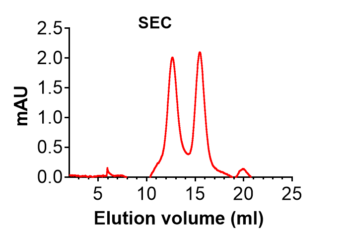 This product has been run on SDS-PAGE with reduced condition. We also evaluated its binding to anti-His antibody with a negative control. The trimeric conformation was evaluated with SEC (Superose 6 column) with two peaks that we assigned one as a trimer fraction peak. The product is not a SEC fraction.