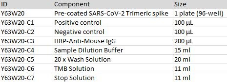 This kit is developed for a standard indirect-ELISA format, providing a rapid detection of anti-SARS-CoV-2 Spike mouse IgG in serum. The kit consists of high-bind detachable 96-well plate pre-coated with trimeric spike protein, Positive control, Negative Control, an HRP-Anti-Mouse IgG secondary antibody, TMB and dilution/wash/stop buffer.