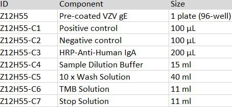 This kit is developed for serologic test for human IgA titer of Anti-VZV gE antibody from serum/plasma or other tissues (e.g. mucosal samples) in vitro. It is for research use only.